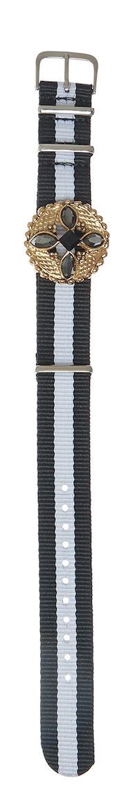 Individualize your bracelet collection with this striped watch strap, detailed with an eye-caching gold-tone charm, highest quality Crystals and a buckle fastening. Special on your wrist, on top of your sweaters and shirts, extraordinary on top of your coat.