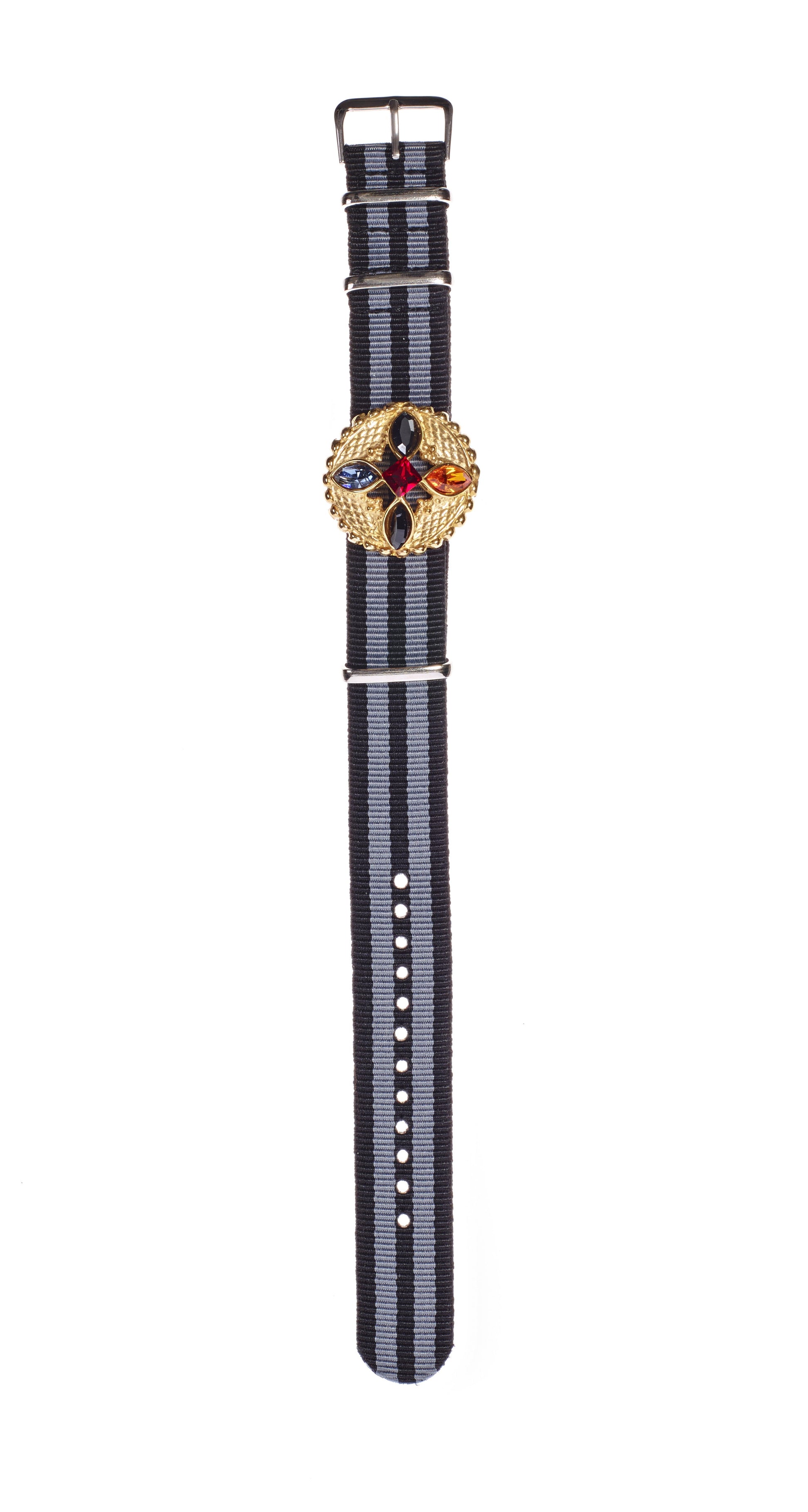 Individualize your bracelet collection with this striped watch strap, detailed with an eye-caching gold-tone charm, highest quality Crystals and a buckle fastening. Special on your wrist, on top of your sweaters and shirts, extraordinary on top of your coat.