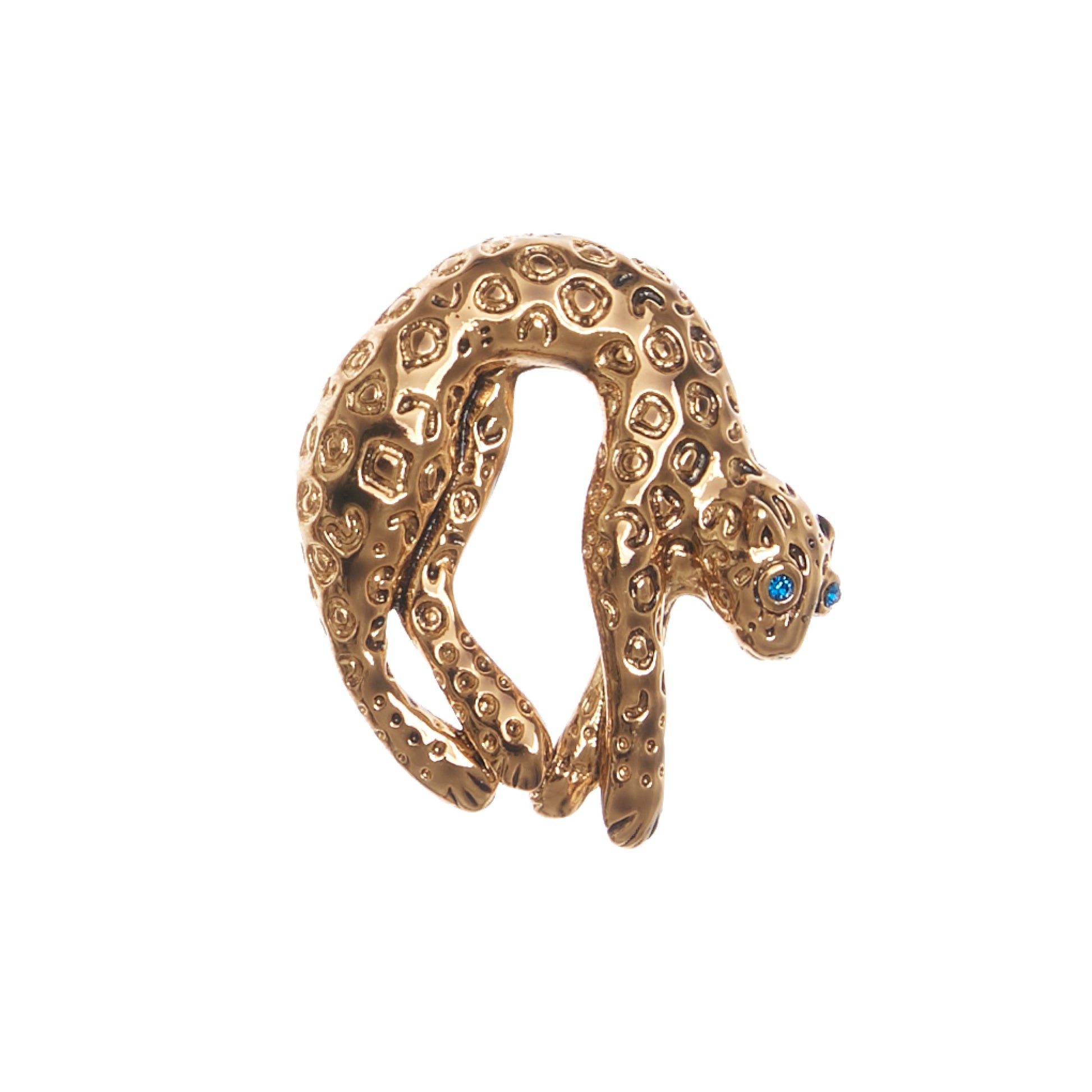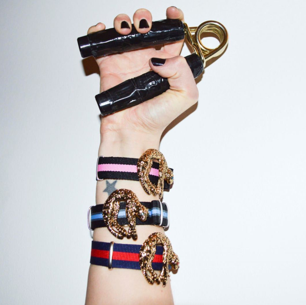 Gabriele’s bracelet – perfect for adding a tough-luxe edge to any outfit. The gold-tone panthermotive charm is placed on a striped polyester band.